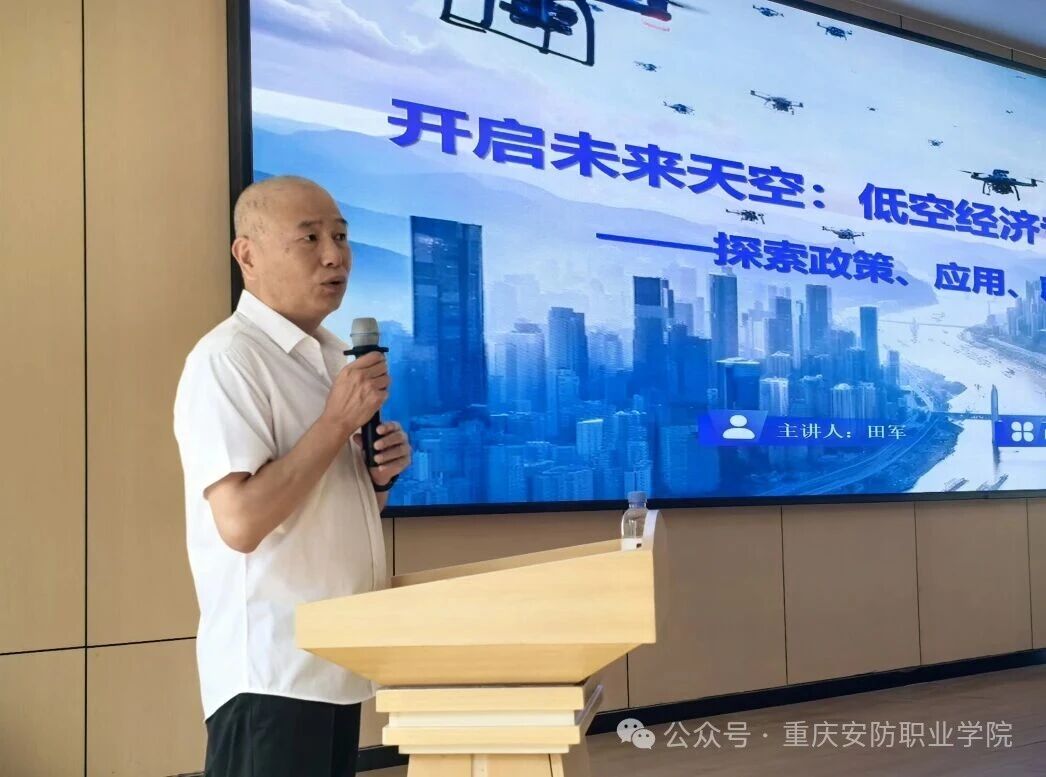 当日下午,重庆兰空无人机技术有限公司董事长田军走进低空经济学院课堂,以“开启未来天空:低空经济专业新生入学导引”为主题,为新生们带来了一场视野开阔、内容丰富的讲座。