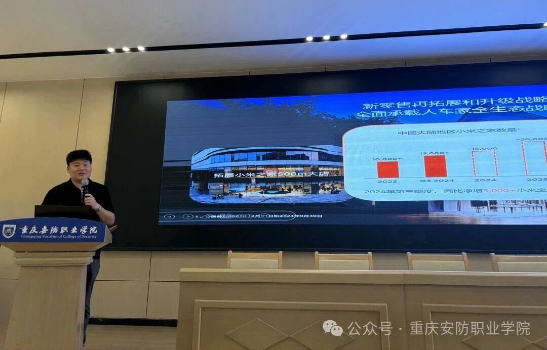 讲座伊始,重庆小米智能生态总经理张树卿先生以《小米学堂第一课:小米智能生态》为题展开分享。他系统阐释了小米“人车家全生态”战略布局,该布局涵盖智能手机、智能电动汽车及AIoT平台等重要板块,展现了智能科技的广阔前景。同时结合小米在智能制造领域的人才需求与产教融合实践,为学生未来职业发展提供了有益参考。
