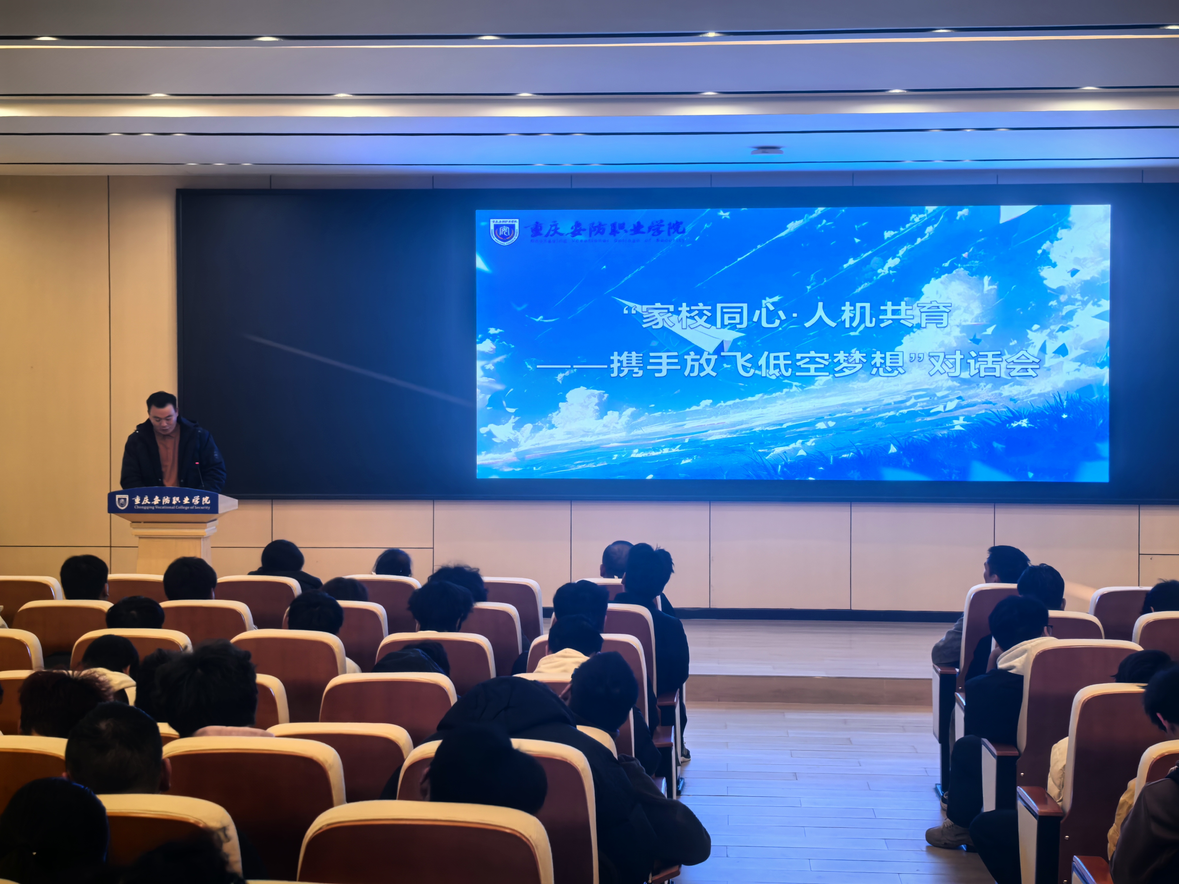 副校长赵福奎在讲话中,代表学校感谢家长们的言传身教与默默支持,希望家校之间建立起牢固的信任纽带,共同播下“家校同心”的种子,践行“人机共育”的理念,努力去实现“放飞梦想”的愿景,为低空经济和强国建设使出“安防贡献”。