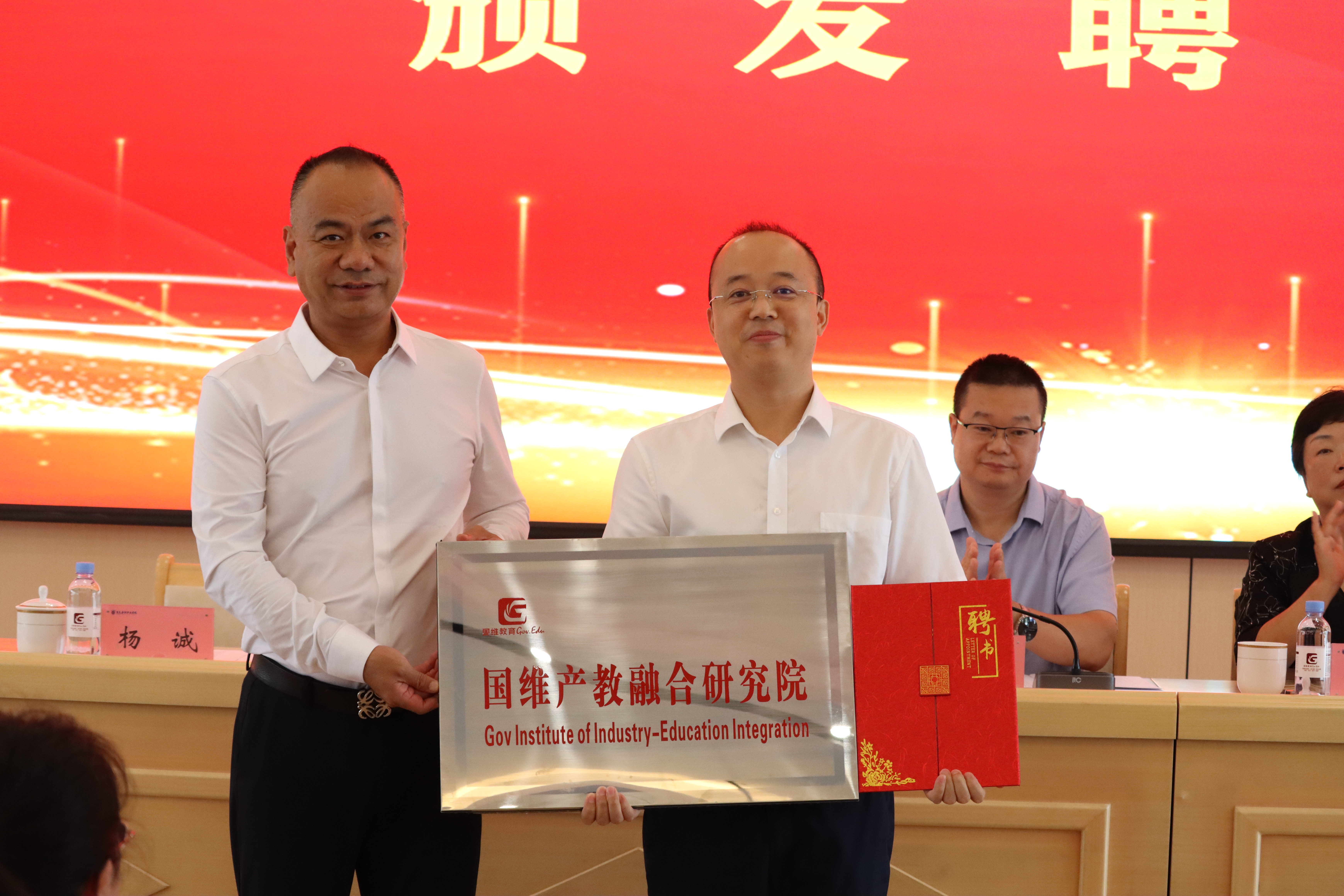 ▲国维集团董事长吕文义为国维产教融合研究院院长杨诚颁发聘书并授牌