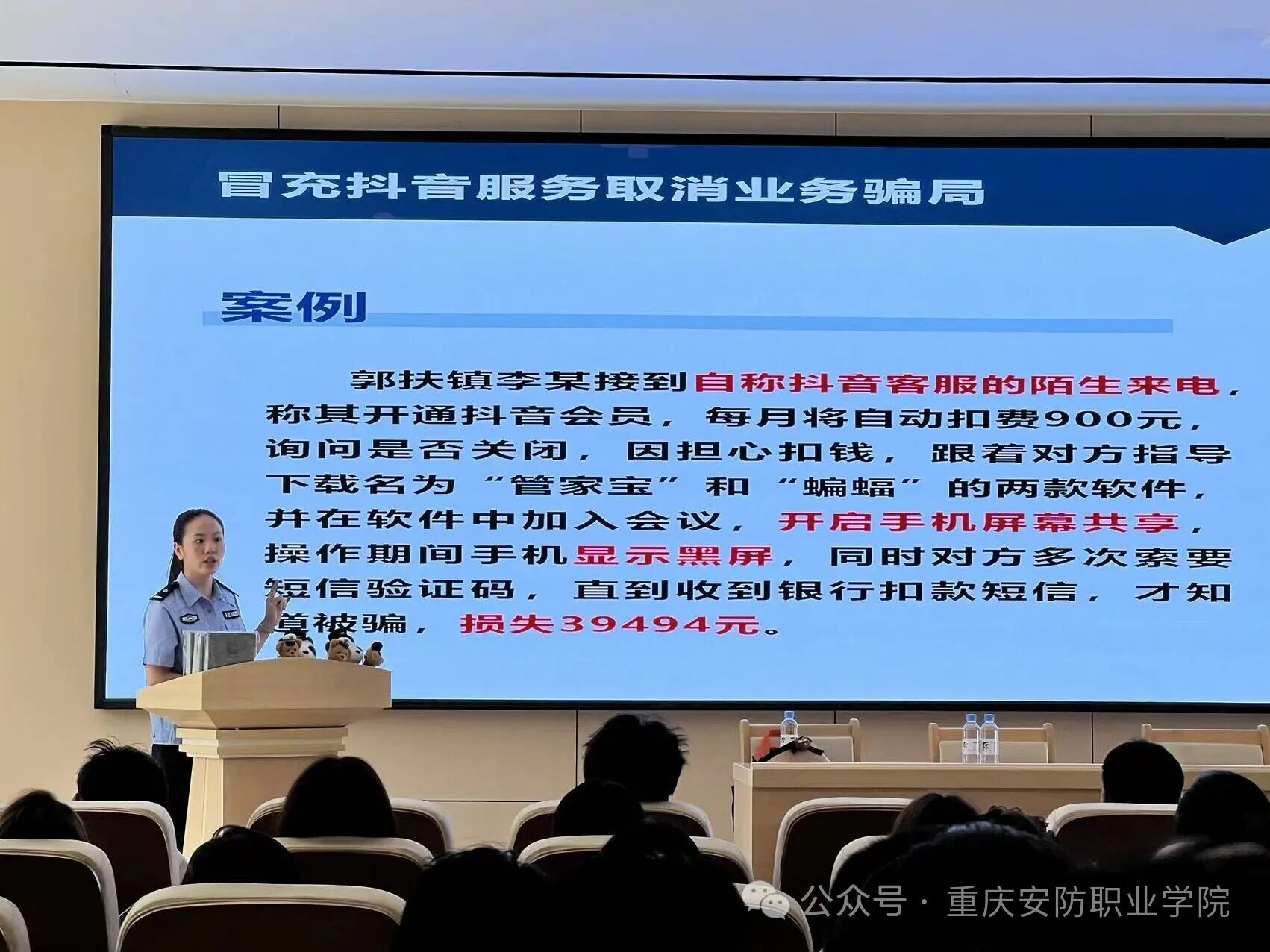 为提高师生的反诈意识,预防和减少校园电信网络诈骗案件的发生,营造安全和谐的校园环境,2025年9月2日,我校联合綦江区反诈骗中心共同举办“全民反诈,我们一綦行动”主题宣讲活动。本次活动由綦江区反诈骗中心副主任何容容及宣传员周纯真担任主讲嘉宾。