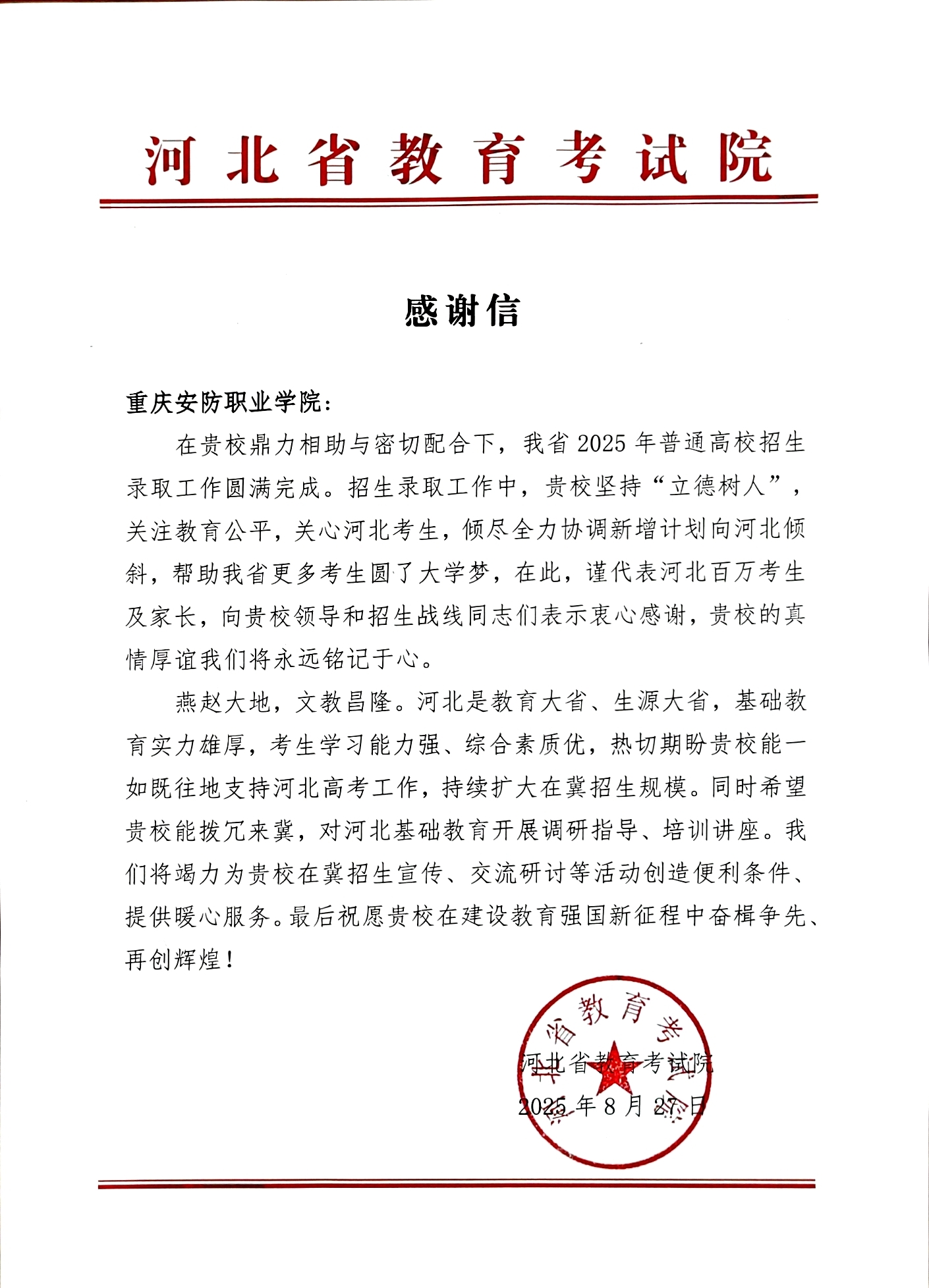 近日,我校收到河北省教育考试院发来的感谢信,信中对我校在2025年普通高校招生录取工作中给予的鼎力支持与密切配合表示高度赞赏和衷心感谢。这封感谢信不仅是对我校招生工作的肯定,更是对我校坚守育人初心、担当社会责任的充分认可。我校衷心感谢考试院的认可,将继续优化招生服务,深化合作交流。