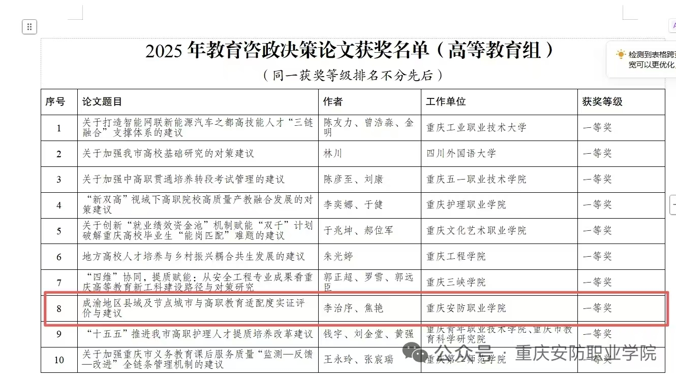 近日,重庆市教育委员会公布了2025年教育咨政决策论文获奖结果。我校李治序、焦艳老师合作完成的《成渝地区县域及节点城市与高职教育适配度实证评价与建议》一文,在全市高校激烈竞争中脱颖而出,荣获高等教育组一等奖(排位第8),让我校在全市民办高校中名列前茅。