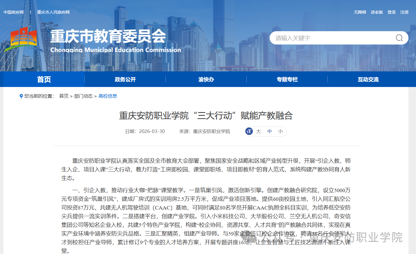 近日,重庆市教育委员会官方网站全文刊发了我校题为《重庆安防职业学院“三大行动”赋能产教融合》的稿件(网址:https://jw.cq.gov.cn/zwxx_209/bmdt/gxxx/202604/t20260410_15603780.html)。这是重庆市教育委员会对我校办学实践的高度认可,标志着我校在产教融合领域的探索成果获得市级教育主管部门的权威认可。