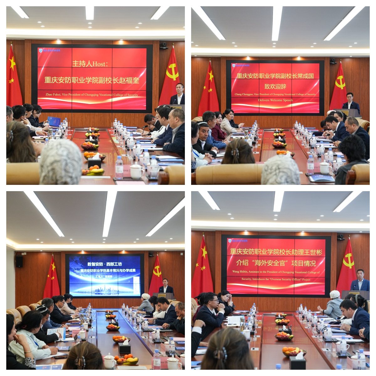 研讨会会上,副校长常成国代表学校致欢迎辞,副校长赵福奎作题为“数智安防∙西部工坊——重庆安防职业学院基本情况及办学成果”汇报,校长助理王世彬围绕“海外安全官”培训项目作系统阐述。乌兹别克斯坦纳沃伊州国立大学和国立矿业技术大学的代表就中乌国际交流合作事宜作了交流发言。